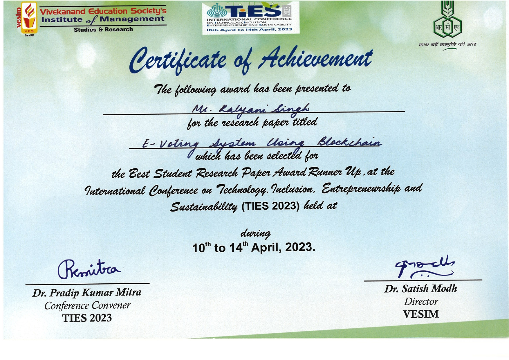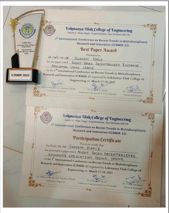 (BE-A)1. Best student Research paper Award Runner Up TIES 2023 conducted by Vivekanand Institute of Management and studies Mumbai on “EVoting System Using Blockchain”.